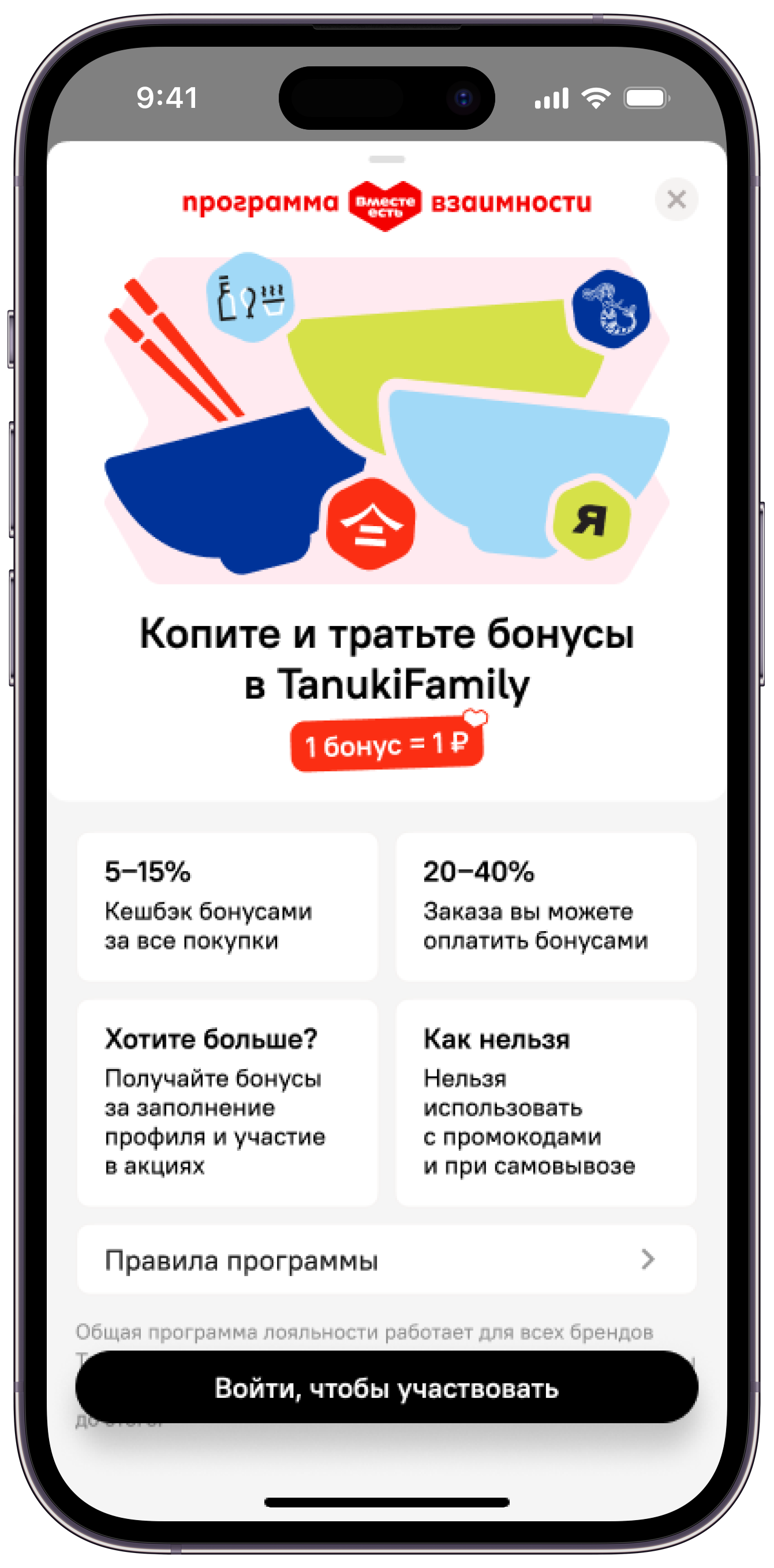 Чем чаще вы делаете заказы, тем выше ваш уровень в программе взаимности. Чем выше уровень, тем больше бонусов мы начисляем за каждый заказ и больший процент стоимости заказа вы сможете оплачивать бонусами. Ваш уровень мы определяем по заказам за последние полгода. Бонусы при оплате заказов обмениваем на рубли по курсу: 1 бонус = 1 ₽. Если вы не посещали рестораны или не заказывали в течение полугода, ваш уровень понижается, а бонусы сгорают. Повышайте свой уровень и делайте каждый свой заказ еще более выгодным!
